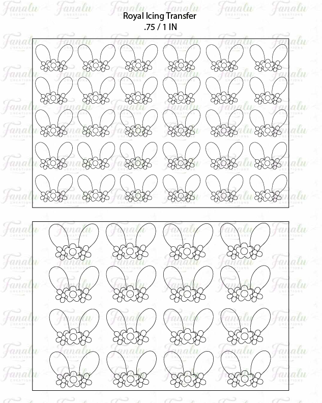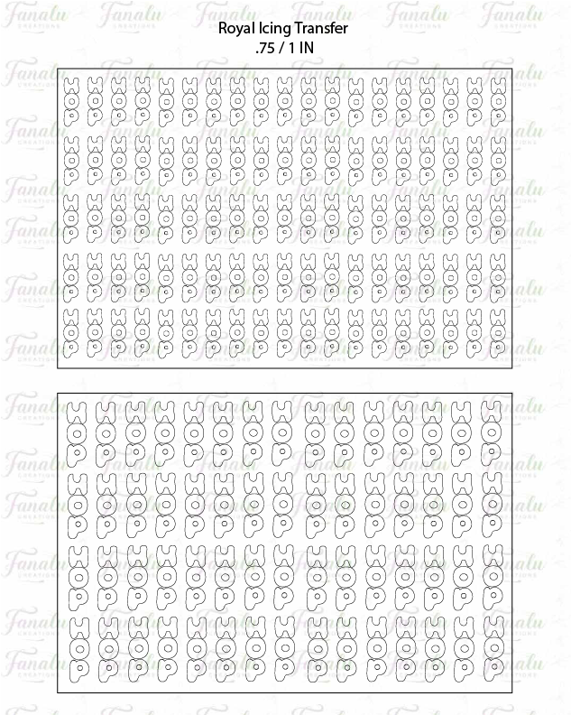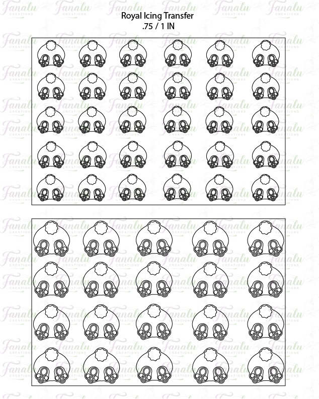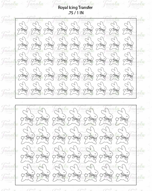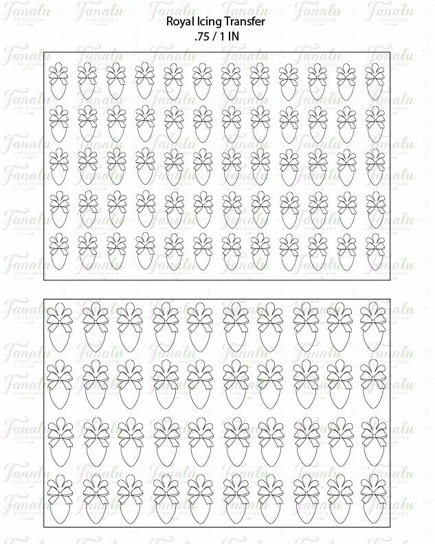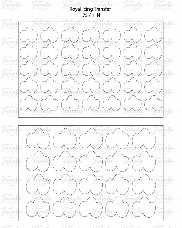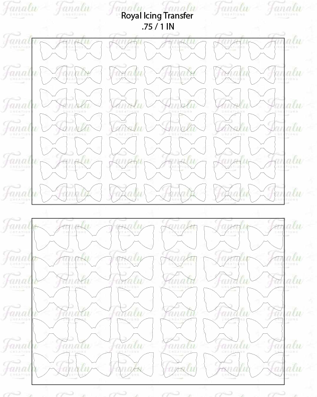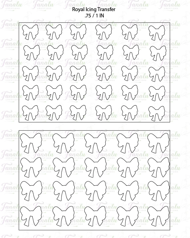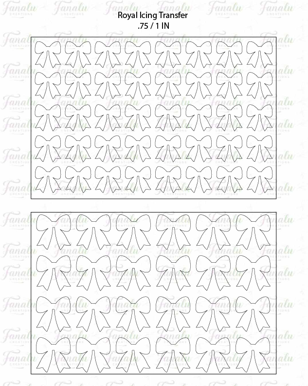 Printable PDF featuring elegant bow royal icing transfers in four sizes: 0.25”, 0.50”, 0.75”, and 1”. Perfect for mini cookies, cupcakes, macarons, cakesicles, and detailed cookie sets for baby showers, birthdays, Easter, and more. Simply print, place parchment or acetate on top, pipe with royal icing, allow to dry completely, and use when needed. Digital download only. No physical item included.